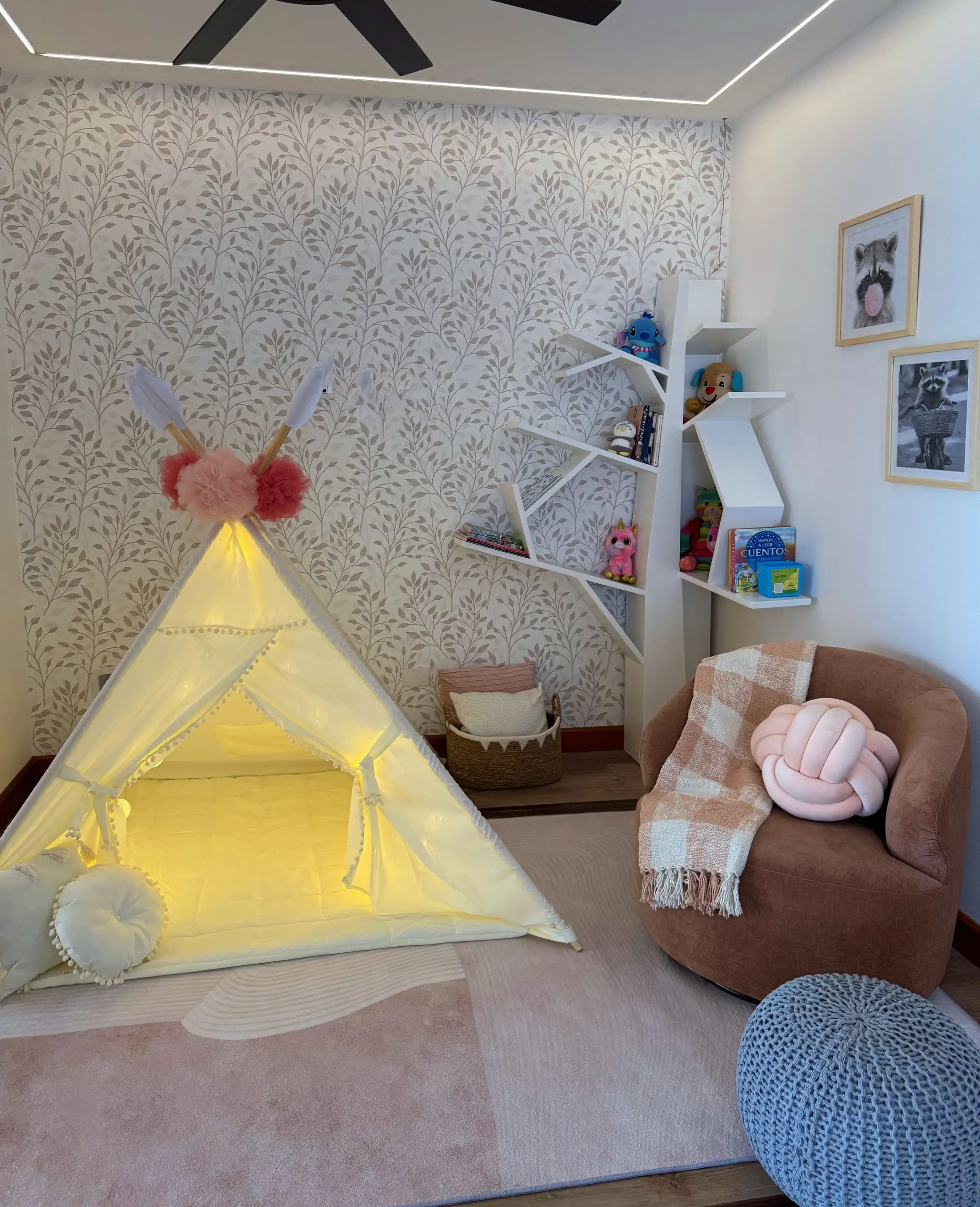 Designed as a joyful escape, this playroom blends soft colors, nature inspired wallpaper, and a tailored bookshelf to create a space where imagination thrives. Rooted in feminine charm and playful spirit.